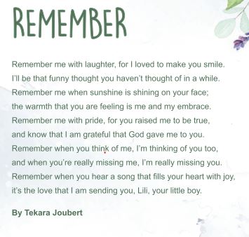 The other poem was written by my niece for Liam's memorial - Remember. It is in the photo on top.